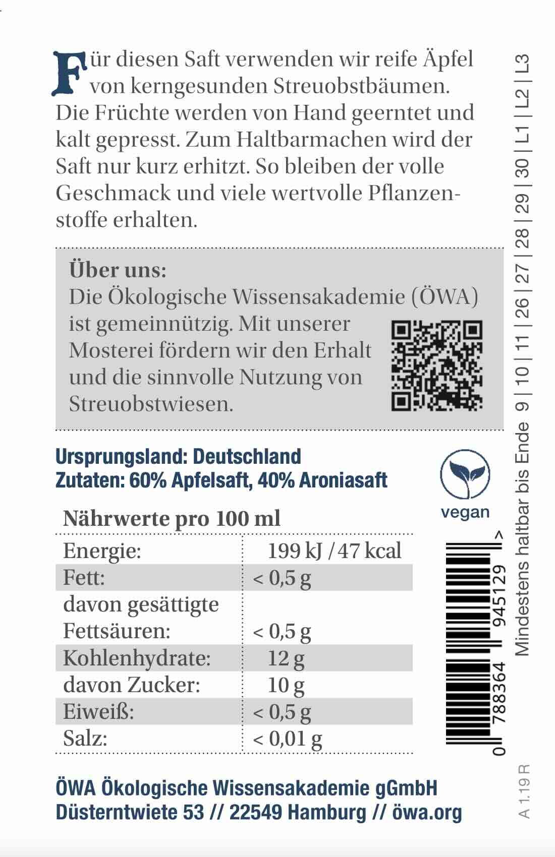 Hinter diesem Saft steht die Ökologische Wissensakademie (ÖWA) in Hamburg. Als gemeinnützige Organisation betreiben wir unsere Mosterei, um den Erhalt und die sinnvolle Nutzung von Streuobstwiesen zu fördern. Mit jedem Glas unseres Safts unterstützt du also nicht nur nachhaltige Landwirtschaft, sondern auch den Schutz einer wertvollen Kulturlandschaft.
