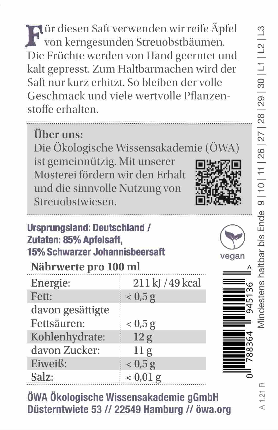 Die Ökologische Wissensakademie (ÖWA) mit Sitz in Hamburg ist eine gemeinnützige Organisation. Mit unserer Mosterei engagieren wir uns für den Erhalt und die nachhaltige Nutzung von Streuobstwiesen. Mit jedem Kauf unterstützt du nicht nur eine naturnahe Landwirtschaft, sondern auch den Schutz einer wertvollen Kulturlandschaft.